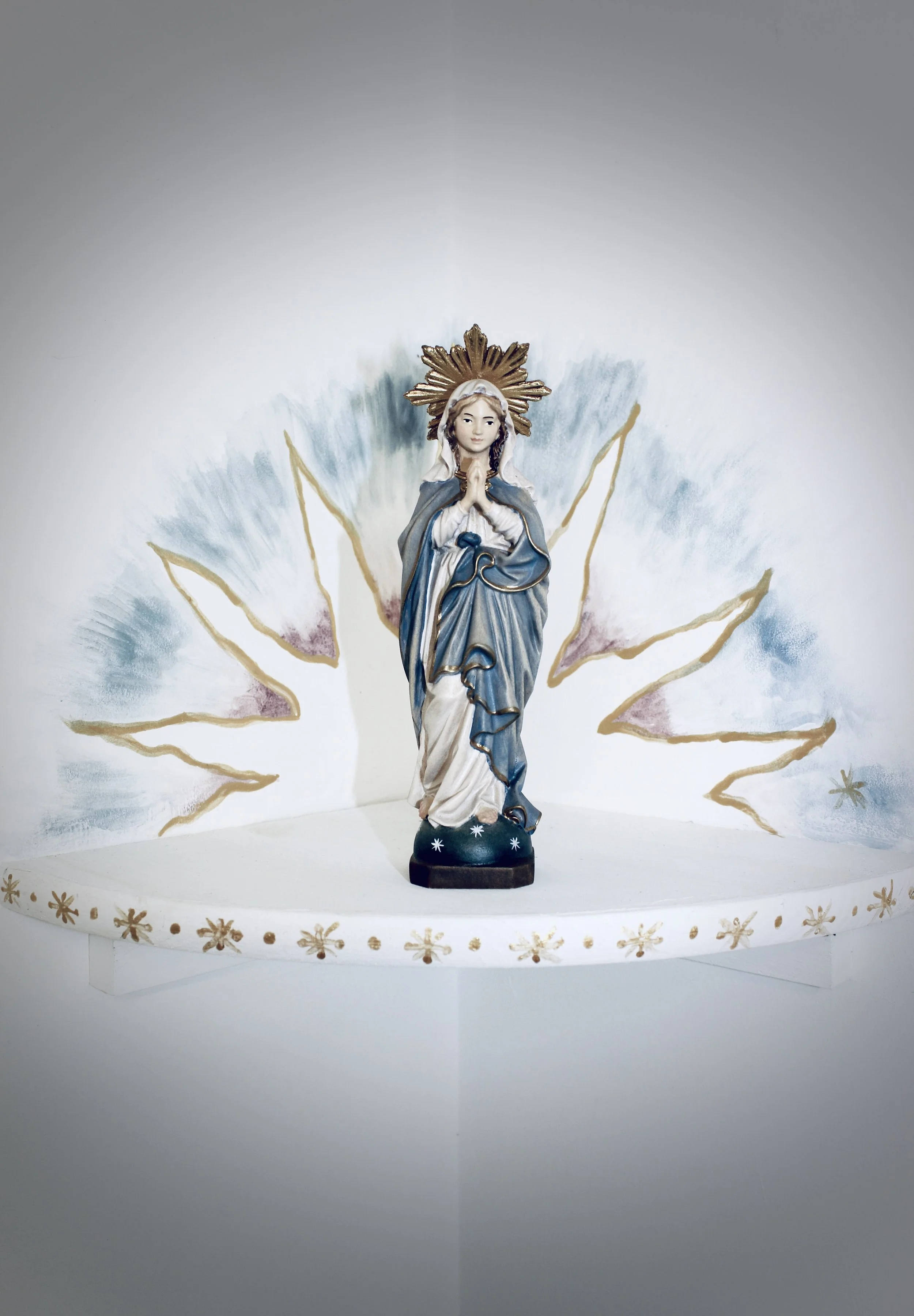 The image above is a photo of a little statue I keep in my studio in Raunds, U.K. The studio is in a converted garage space and the sun rises behind it. I love the little walk through the garden from the house to the studio. One of the many titles of Our Lady is Morning Star and I named the studio in her honour.